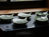 ・登作 木の葉皿 2階のオーディオセットの上に静かにたたずむ皿。暗くて見えませんが、透明感のある緑のきれいな皿です。