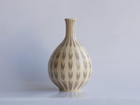 ・晃子作 泥彩花器 白い土に淡い色合いでやわらかな雰囲気の矢羽根をデザインしました。