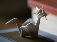・折り紙アート 地区の方にいただいた折り鶴。よく見ると尾の部分にさらに鶴が2羽。折り紙は無限大だと思った。